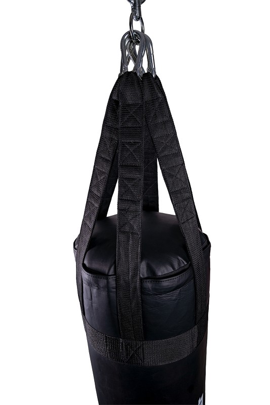 *Je nachdem wie stark der Boxsack befüllt ist, kann es für die Reduzierung der Aufhängungslänge in der 3. und kürzesten Stufe notwendig sein etwas Füllmaterial aus dem Boxsack zu entnehmen. Die Öffnungen der Schlaufen können, vor dem Verstellen der Karabiner, bequem mit eine stabilen Stift geweitet werden.