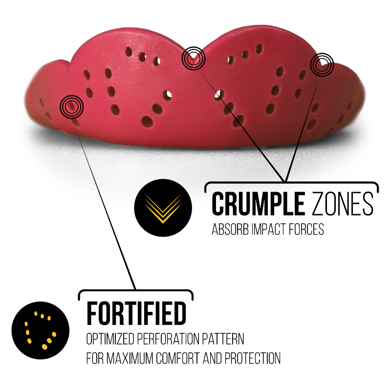 Der individuell angepasste und bei Bedarf neu formbare SISU™ NextGen-Mundschutz verfügt über breiteres Bisspolster, abgerundete Ecken und verbesserte Modellierbarkeit. Abgerundete und abgeschrägte Ränder verringern die Kontaktfläche zwischen Mundschutz und Mund. Die optimierte Perforation sorgt für die maximale Verteilung von außen einwirkender Kräfte. Doch hervorragender Schutz ist nicht die einzige Aufgabe der Perforationen. Sie ermöglichen außerdem eine so präzise und individuelle Passform, dass Sportler den Mundschutz während des gesamten Spiels oder Trainings im Mund behalten kann. Darüber hinaus lassen die Perforationen einen ungehinderten Fluss von Luft und Speichel zu, so dass Sportler während des Matches ungehindert sprechen, atmen und trinken können.